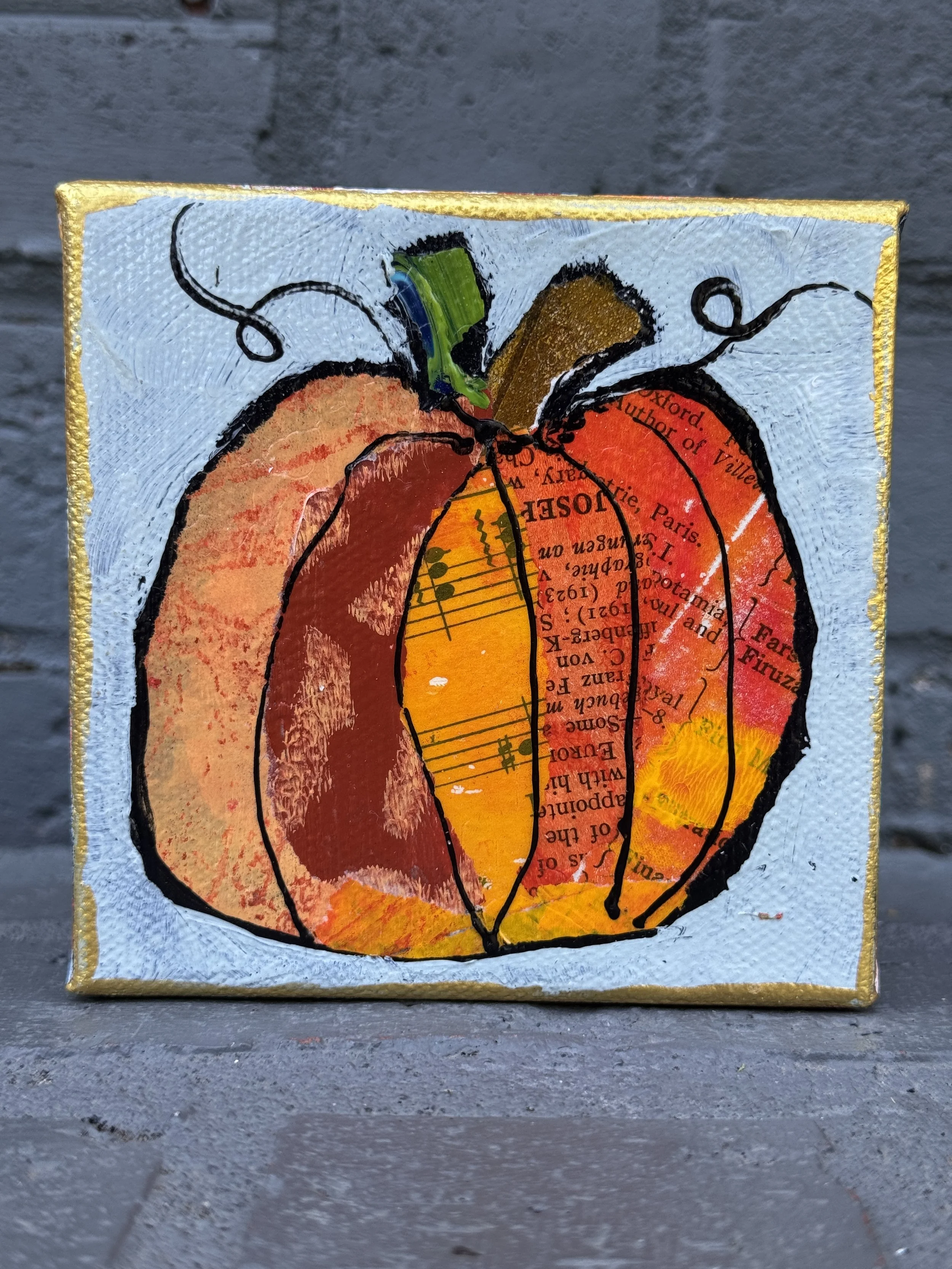 This collage pumpkin beautifully combines vintage found papers. The collected papers are handprinted in the studio using a gelli plate and then layered and placed to create a one-of-a-kind work of art. Each layer tells a unique story, and invites viewers to explore the intricate details and hidden gems within. Each piece is signed by the artist.
