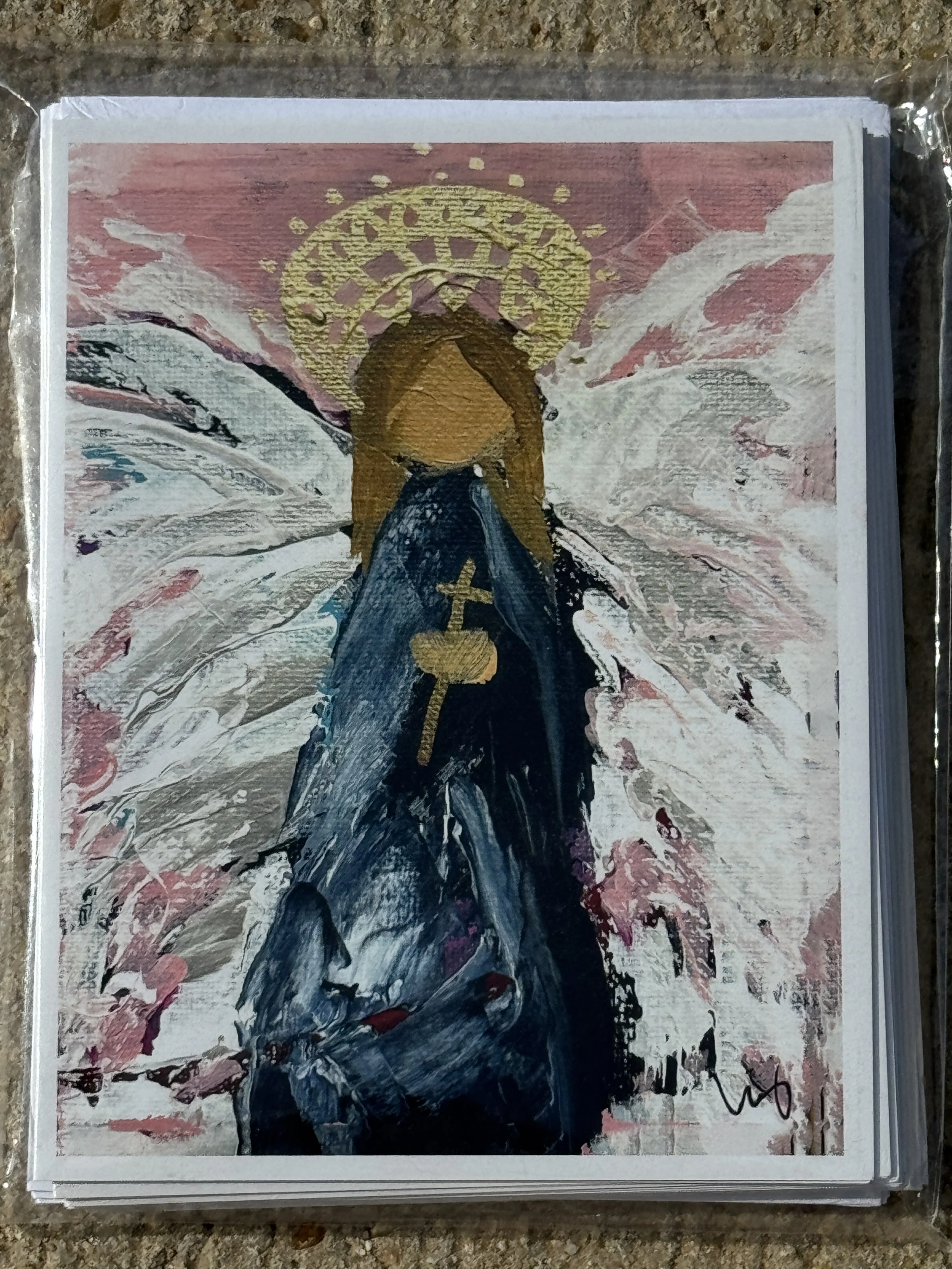 This painting was created on a 4x4 gallery wrapped canvas with 1.5 inch sides, suitable for hanging or sitting on a shelf or table.