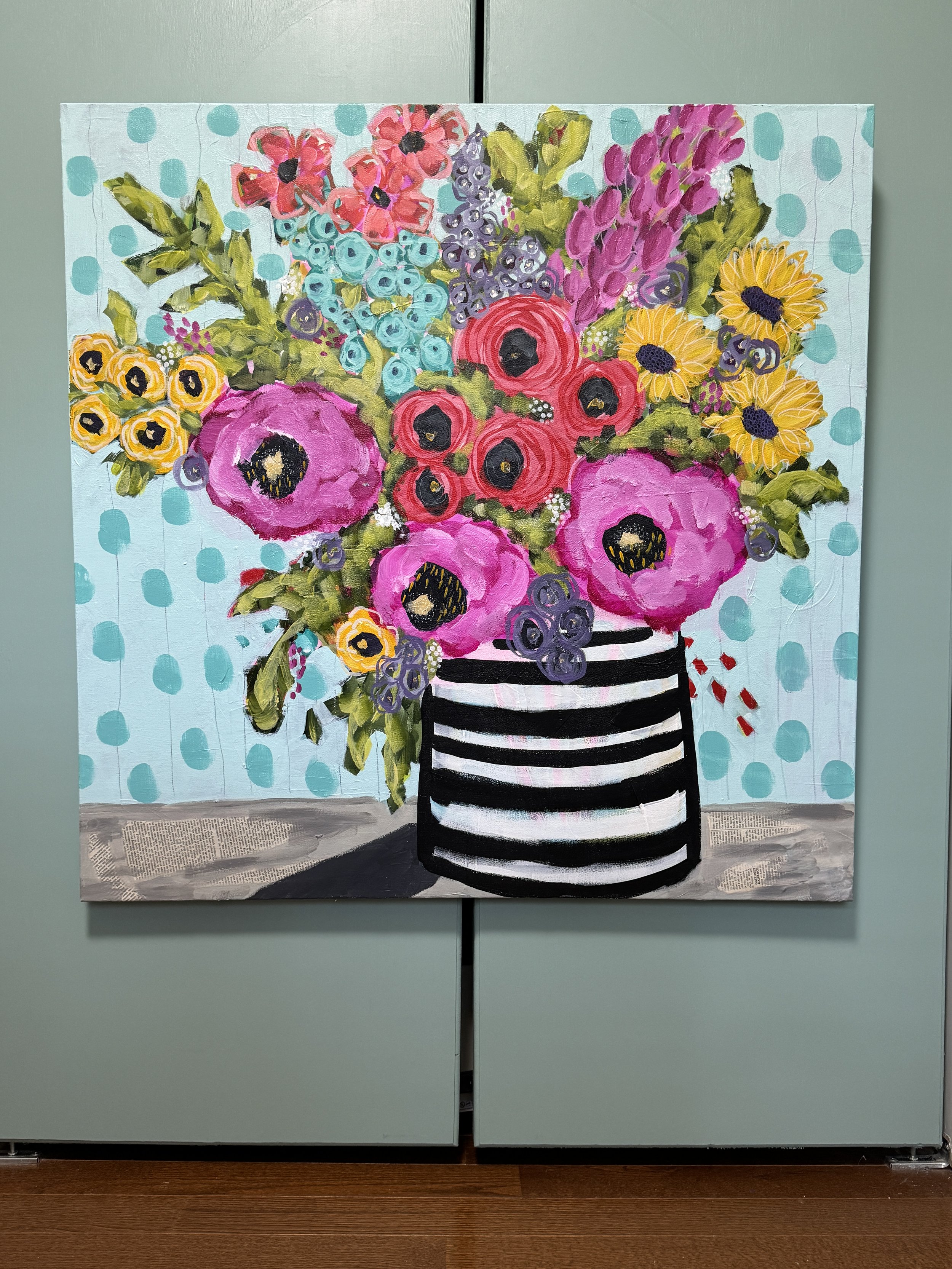 This painting was created on gallery wrapped canvas with 1.5 inch sides, suitable for hanging as is.